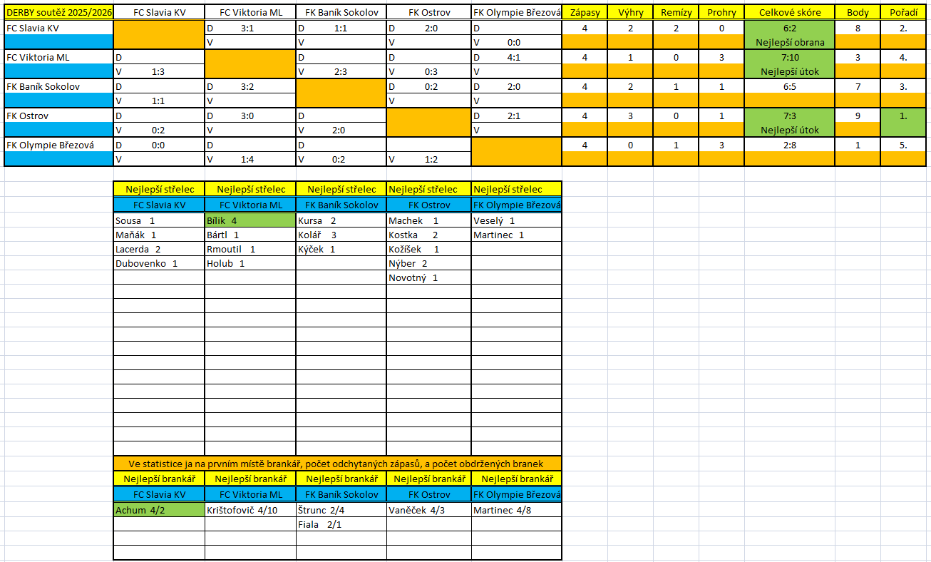 Podzimní část Derby soutěž 2025/2026 skončila, a tak se prozatím může FK Ostrov pochlubit celkovým prvním místem. Zdaleka není nic rozhodnuto, a tak se můžeme společně těšit na další derby zápasy v jarních kolech.