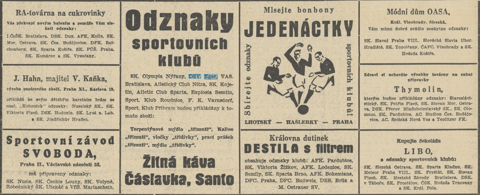 „Dáváme naší mládeži možnost rozhodovati o fondu dorostenců, který obnáší prozatím 20 000 Kč, a který jejím přičiněním může dosáhnouti i několikanásobné výše. V každé domácnosti je nutno denně kupovati různé předměty. U mnohých z těchto předmětů naleznete naše odznaky. Nuže – stačí věnovati jen trochu pozornosti naší akci, abyste si mohli získati cennou sbírku klubových odznaků. Snahou každého výkonného sportovce je docíliti co nejlepšího výkonu, a tím dosáhnouti uznání sportovní věřejnosti. Někdy však i nejlepší výkon na hřišti jednotlivci nestačí, aby mohl účinně zasáhnouti do rozhodování v životě svého klubu. Dnes můžete však svému klubu platně přispěti. Nasbíráte-li odznaky klubů námi vydané, můžete pak spolurozhodovati, jak má býti naloženo s uvedeným obnosem. Můžete se tak státi i příznivcem klubu, o který máte zájem. Můžete hlasovati, aby z peněz dostal určitý díl pro svůj dorost, tedy na výchovu mladých sportovců – snad budoucích representantů našeho státu. Takováto podpora dorosteneckých odborů má ohromný význam pro kluby, které pro výdaje všeho druhu nemohou své dorostence dotovati tak, jak by to budoucnost našeho sportu vyžadovala.