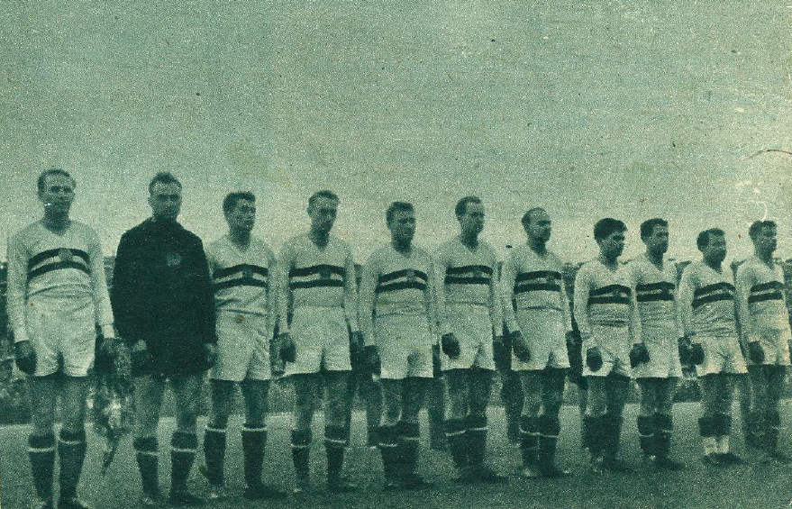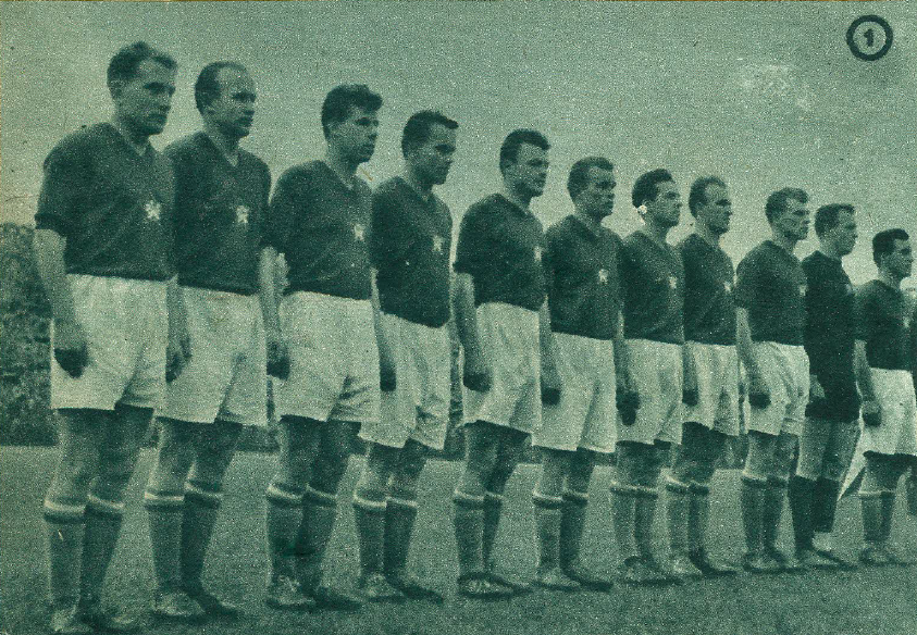 Zleva: Hidegkuti, Geller, Kotasz, Szojka, Machos, Karpati, Teleki, Fenyvesi, Bozsik, Budai, Kocsis