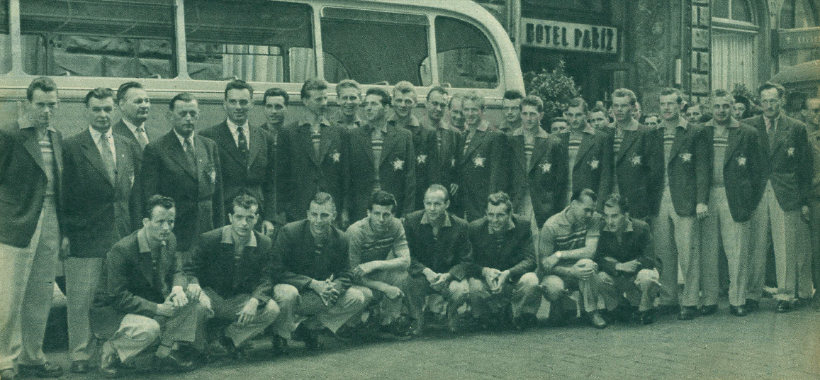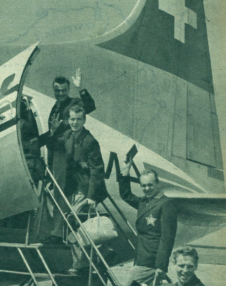 Zleva stojí: Moravčík, technický vedoucí Vereš, lékař výpravy MUDr. Topinka, vedoucí výpravy Blažej, předseda SVTVS Pleskot (přišel se s výpravou rozloučit), Novák, masér Ondráček, Dolejší, Borovička, Pluskal, Hledík, Schroif, Bílý, Feureisl, Pavlovič, Molnár, Hertl, Procházka, trenér Rýgr, redaktor Čs. sportu Žemla