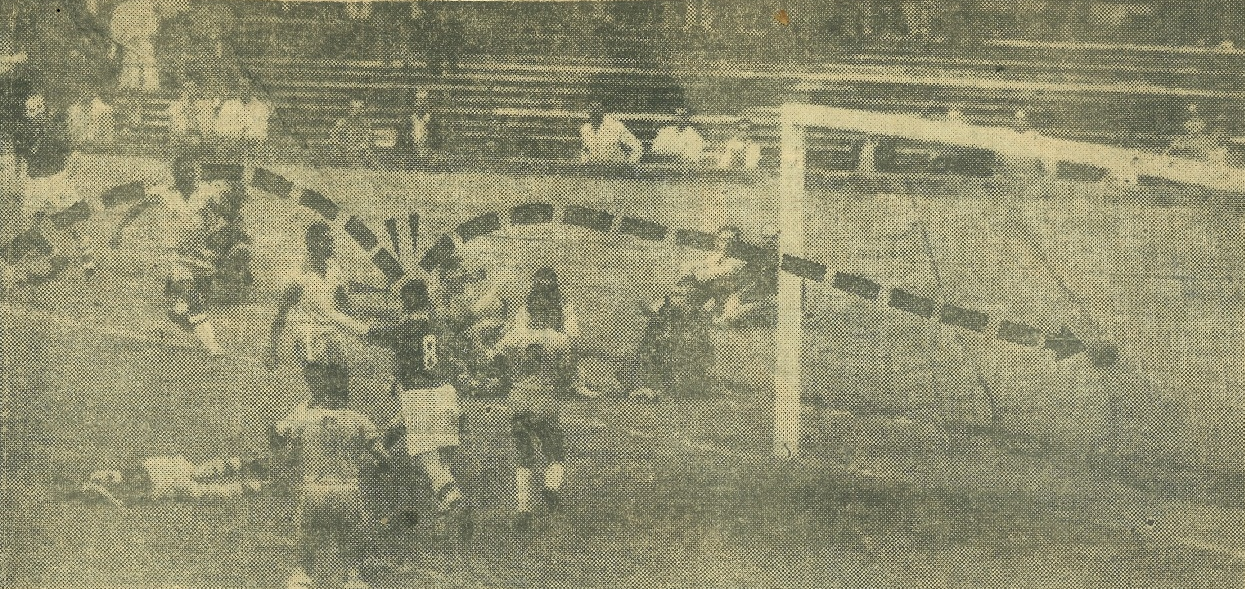 Sedmdesát let starý obrázek z brazilských novin. Feureisl po výskoku leží na zemi a Moravčík dává branku na 1:0.